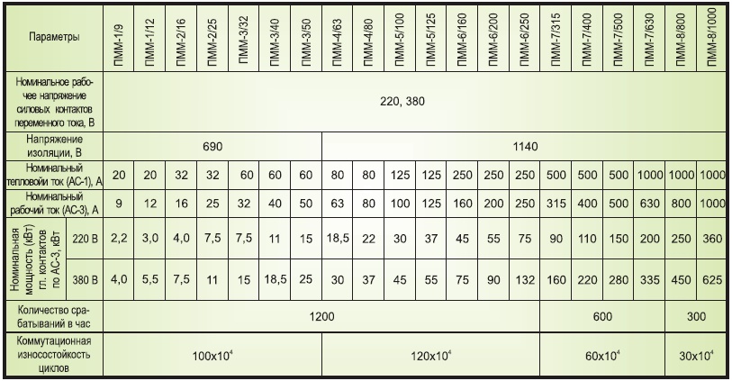 Технические характеристики пускателей ПММ (1-8 величины)