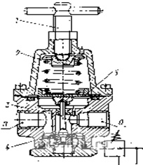 Регуляторы давления с резиновой диафрагмой имеют более простую конструкцию и высокую надежность в работе в сравнении с поршневыми регуляторами. Регулятор давления типа В57-1 показан на рис. Сжатый воздух подается к штуцеру через резьбовое отверстие П в корпусе 8. При впуске сжатого воздуха пружина 2 через толкатель 7 отжимает клапан 6 от плоскости корпуса и в образовавшийся кольцевой зазор между резиновой шайбой 4 клапана и торцом центрального отверстия корпуса воздух попадает в отверстие О, а затем в воздухопровод системы. Одновременно сжатый воздух через отверстие К поступает в полость М и на-имая на диафрагму 3, уравновешивает силу давления пружины 2. При уменьшении давления сжатого воздуха в системе, к которой подключен выходным отверстием О регулятор, ниже установленной величины указанное равновесие нарушится. Диафрагма 3 под действием пружины 2 прогнется и через толкатель 7 отожмет клапан 6, увеличив поступление сжатого воздуха из отверстия П в выходное отверстие О. Клапан 6 будет открыт, пока давление в выходном отверстии О и в полости М не повысится до заданной велнчины, и диафрагма 3, сжимая пружину 2, выпрямится. Следовательно, давление на выходном отверстии О регулятора поддерживается постоянным и соответствует силе пружины 2. Заданное давление сжатого воздуха на выходном отверстии О регулируется винтом I, сжимающим пружину 2. Когда пружина 2 разжата, клапан 6 с резиновым кольцом 4 под действием пружины 5 перекрывает проход воздуха из отверстия П в отверстие О. Для лучшего уплотнения в клапан 6 установлено кольцо 4 из маслостойкой резины.