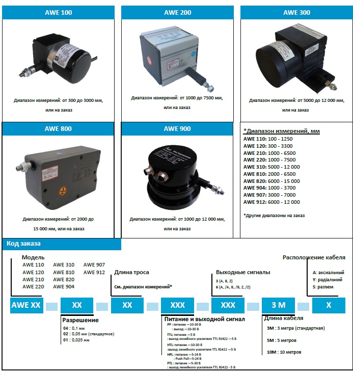 Тросовые датчики перемещений серии AWE – это преобразователи на основе инкрементальных тросовых энкодеров, преобразующие линейное перемещение в кодированные цифровые импульсы. Устройство состоит из инкрементального энкодера, приводимого в действие движением (наматыванием или разматыванием) стального троса. Датчики просты в подключении. Подключение дисплея или указателя положения позволяет получить отличную систему для измерения линейного перемещения на станках, машинах для обработки дерева, мрамора, стекла и автоматическом оборудовании.