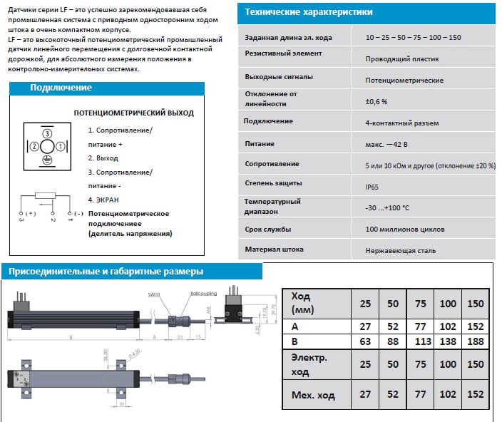 Датчики серии LF – это успешно зарекомендовавшая себя промышленная система с приводным односторонним ходом штока в очень компактном корпусе. LF – это высокоточный потенциометрический промышленный датчик линейного перемещения с долговечной контактной дорожкой, для абсолютного измерения положения в контрольно-измерительных системах.