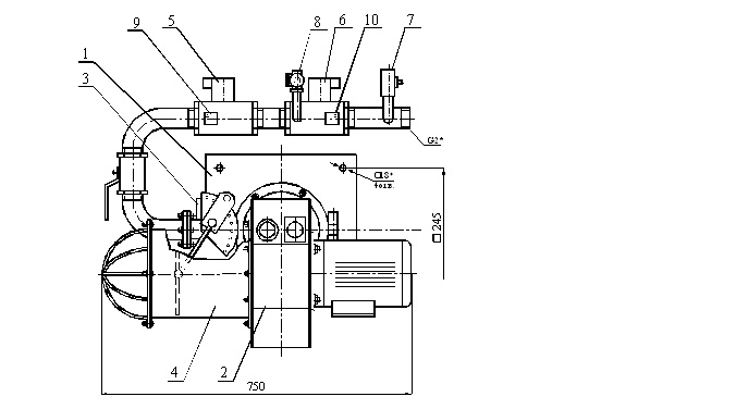1 - корпус горелки 2 - блок вентилятора 3 - система пропорционального регулирования газ-воздух 4 - воздушная заслонка; 5 - рабочий клапан, 6 - отсечной клапан, 7 - трехходовой кран для манометра, 8 - клапан запальника, 9 - датчик давления газа «высокое», 10 - датчик давления газа «низкое».