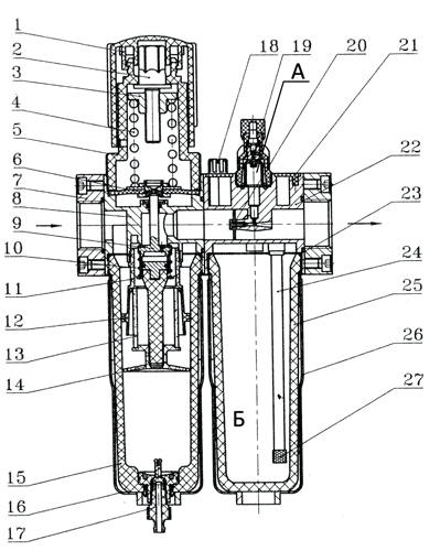 Далее воздух попадает в регулятор давления. Основным элементом регулятора давления воздуха является измерительная мембрана 6, закрепленная в корпусе 5. Жесткий центр мембраны поджат с одной стороны пружиной 4 с регулирующим винтом 2, гайкой 3 и рукояткой 1, а с другой стороны штоком 9 с тарельчатым клапаном, поддерживаемым пружиной 10. Шток 9 имеет проточку, соединяющую выход регулятора с камерой под тарельчатым клапаном. Пружина 4 воздействует на мембрану 6 (изменение усилия воздействия производится рукояткой 1), а через неё и шток на тарельчатый клапан 9 и поддерживающую пружину 10. Если усилие, создаваемое регулирующей пружиной 4 превышает усилие, создаваемое поддерживающей пружины 10, то тарельчатый клапан 9 отрывается от седла и сжатый воздух с входа регулятора поступает на его выход. Тарельчатый клапан 9 будет открыт до тех пор, пока суммарное усилие создаваемое давлением в камере под измерительной мембраной 6 (давление в этой камере равно давлению на выходе регулятора), усилие поддерживающей пружины 10 и усилие поджатия тарельчатого клапана 9 создаваемого давлением в камере под ним (давление в этой камере равно давлению на выходе регулятора) не превысят усилия создаваемого регулирующей пружиной 4. Суммарное усилие, определяется выходным давлением и усилием поджимающей пружины 10, т.о. как только давление на выходе регулятора превышает настроенное, тарельчатый клапан 9 отсекает выход регулятора от его входа, тем самым препятствуя дальнейшему росту выходного давления. Когда (из-за потребления сжатого воздуха) давление на выходе регулятора падает, ниже настроенного, тарельчатый клапан 9 открывается и осуществляется поднятие давления до настроенного, т.о. и осуществляется поддержание настроенного давления.