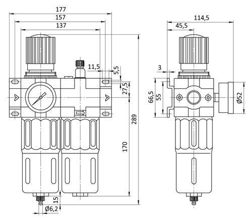 Габаритные и присоединительные размеры блока подготовки воздуха серии CN