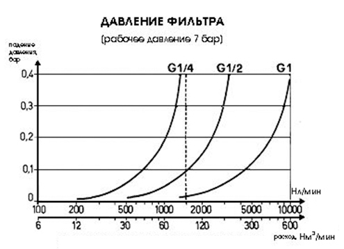 Для качественной очистки воздуха падение давления на фильтре должно находится в пределах 0,1 – 0,3 бар. Это связано со средней скоростью движения воздуха в фильтре. Если падение давления на фильтре при планируемом расходе оказалось меньше 0,1 бар, то скорость воздуха в нем будет невысока, следовательно, центробежная сила, действующая на частички влаги и масла в турбулентной зоне мала и эффективность очистки падает. В таком случае, необходимо переходить на фильтр с меньшего типоразмера и, наоборот, при падении давления более 0,3 бар необходимо выбрать больший фильтр т.к. неоправданное увеличение потерь давления воздуха при его транспортировании от компрессора к потребителю значительно сказывается на стоимости использования сжатого воздуха.