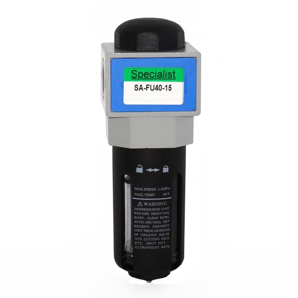 Фильтры воздуха пневматических систем серии FU поставляются с присоединительными размерами G1/4"~G1". Фильтры серии FU относятся к фильтрам циклонного типа и используются для очистки воздуха пневматических систем от капельной влаги и масла при давлении до 8 Бар. Другими словами они отделяют от воздуха уже сконденсировавшиеся пары влаги, поэтому их необходимо устанавливать около устройства потребляющего сжатый воздух, а не около компрессора, после которого воздух еще горячий и влага в нем еще не успела сконденсироваться. Тонкость фильтрации составляет 25мкм. Нами поставляется две основные модификации фильтров с полуавтоматическим и автоматическим сбросом конденсата. При полуавтоматическом сбросе, влага из колбы фильтра сбрасывается только после падения давления на входе в фильтр, те при отключении давления. В фильтре с автоматическим сбросом конденсата, слив воды происходит при достижении заданного уровня жидкости в колбе в независимости от наличия давления воздуха.