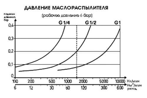 К примеру на этом графике видно, что падение давления на маслораспылителе с присоединительной резьбой G1/4,составляет 0,2 бара при расходе воздуха через него более 500 литров в минуту. Таким образом при расходе воздуха через него менее 500 литров в минуту, работа данного маслораспылителя будет малоэффективной, а при расходе менее 200 литров в минуту (давление давления 0,1 Бар) практически не будет распыления масла.