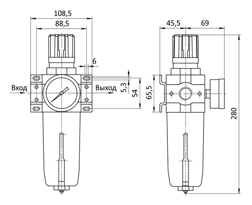 Габаритные и присоединительные размеры фильтра-регулятора серии WU